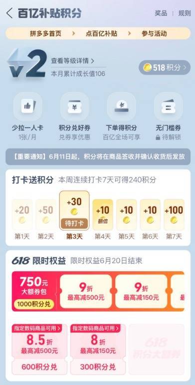 ▲百亿补贴推出积分新玩法,用户下单可累计积分兑换优惠券。此外,美妆、护肤、母婴、宠物等品牌也通过拼多多百亿补贴实现了爆发式增长,雅诗兰黛、潘婷、馥蕾诗等国际品牌在大促期间的销量环比增长了160%;薇诺娜、花间颂、彩棠等国货品牌环比增长了150%;美素佳儿奶粉的销量环比增长了近6倍;babycare、帮宝适的纸尿裤分别增长了151%和137%;蓝氏、百利、冠能等宠物粮品牌的销量增长了7倍以上,PIDAN等猫砂品牌增长了2倍。